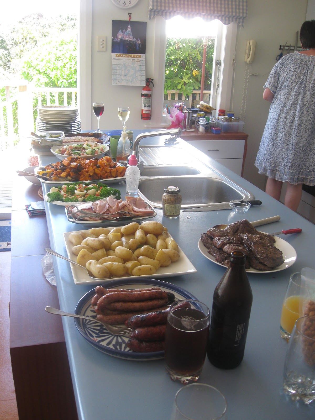 I barbecued sausages and steak. The steak was sirloin marinated in red wine, fresh ginger and an orange and tarragon mustard. The sausages were Island Bay pork and fennel, and Park Avenue kolbaz.